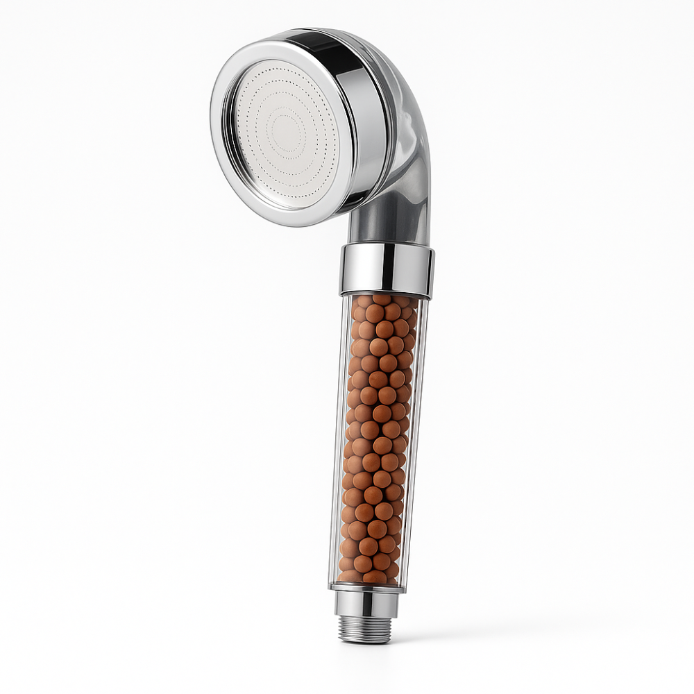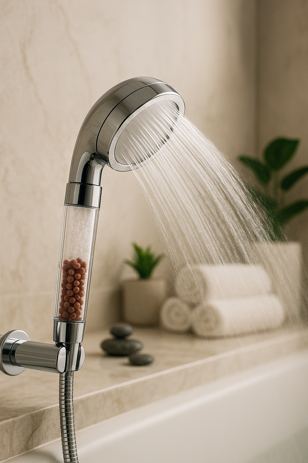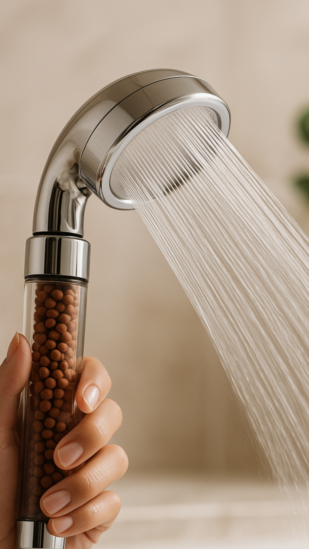 Chaque douche dépose du chlore et du calcaire sur ta peau et tes cheveux. Résultat : tiraillements, rougeurs, cheveux ternes et perte de confort.