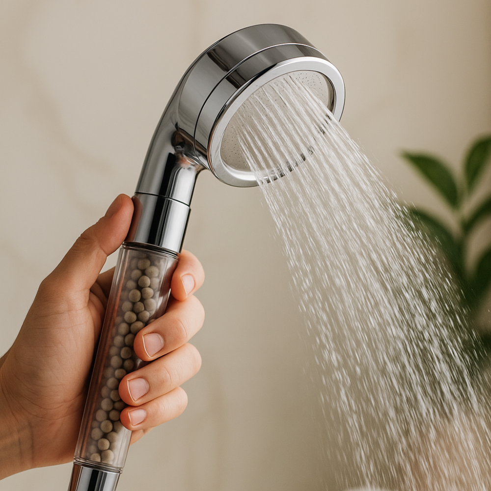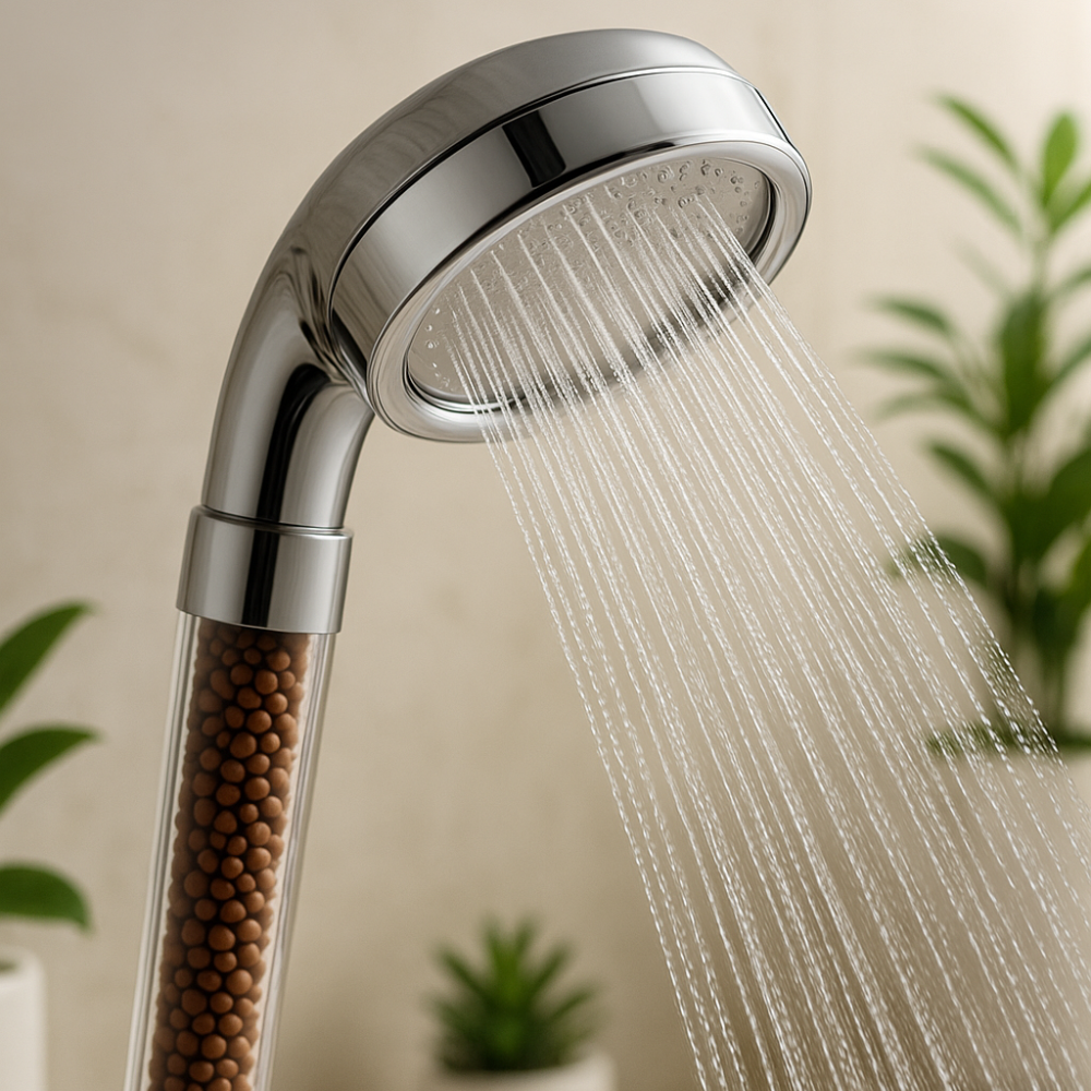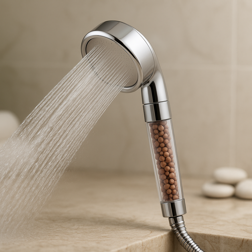 Chaque douche dépose du chlore et du calcaire sur ta peau et tes cheveux. Résultat : tiraillements, rougeurs, cheveux ternes et perte de confort.